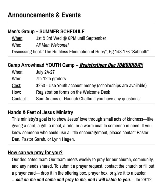 As a church we believe in the power of prayer and bringing requests before God. We meet every Wednesday at Noon. Contact the church to let us know how we can pray for you.